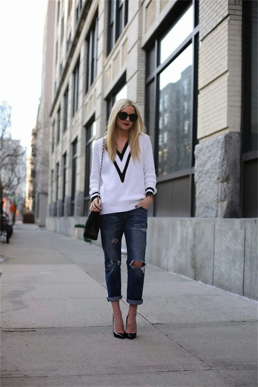 9. How to wear nautical stripe V-neck sweaters & white jeans